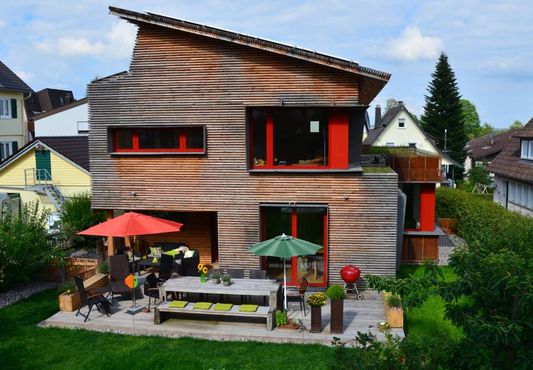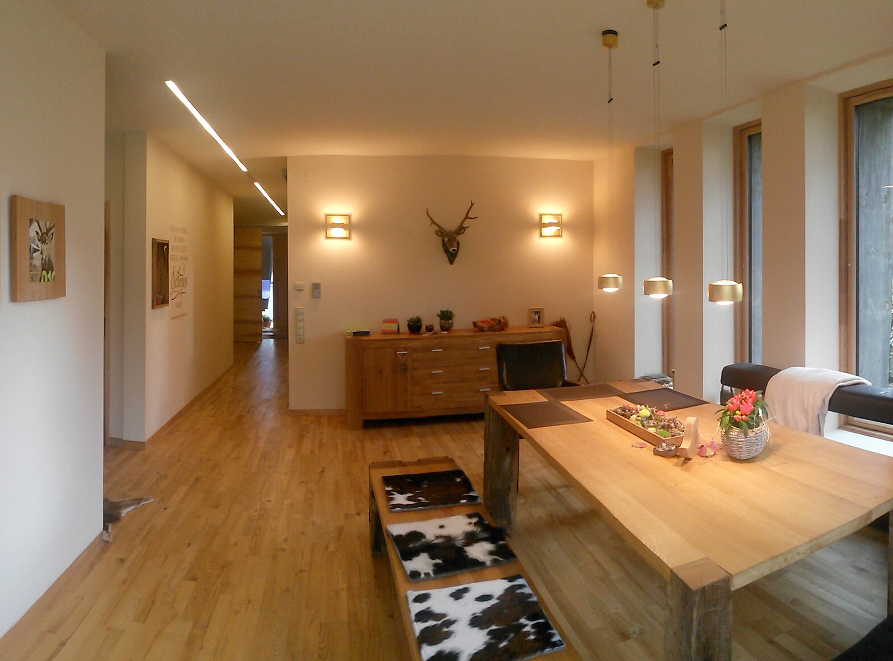 Am 21.10.2011 brennt das Wohngebäude in Freudenstadt. Die besondere Herausforderung stellt die Einbindung in das sensible, gewachsene städtebauliche Umfeld dar. Klare Formensprache, heimische und ökologische Baustoffe und regenerativen Energien sind Entscheidungsgrundlagen zur Planung. Mehr Energie mit dem Gebäude zu produzieren wie gebraucht wird als Grundsatz. Mit der innovativen „Eis“Heizung wird extrem effektiv die Wärme über die Wärmepumpe produziert, Batterien speichern den Strom, kontrollierte Wohnraumlüftung und Grauwassernutzung runden den Nachhaltigkeitsgedanken ab. Der Bürobereich ist durch den Kubus und den CorTen Stahl hervorgehoben, der Wohntrakt mit Lärche-Lamellenschalung und den Bilderrahmen mit Svarre Fenstern gestaltet. Lichtdurchflutet und naturverbunden durch große Fenster im Süden und Westen zeigt sich der Lebensbereich im Innern. Die Außen- und Innengestaltung wird durch das Element Holz „alt und neu“ dominiert.
