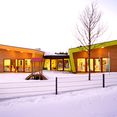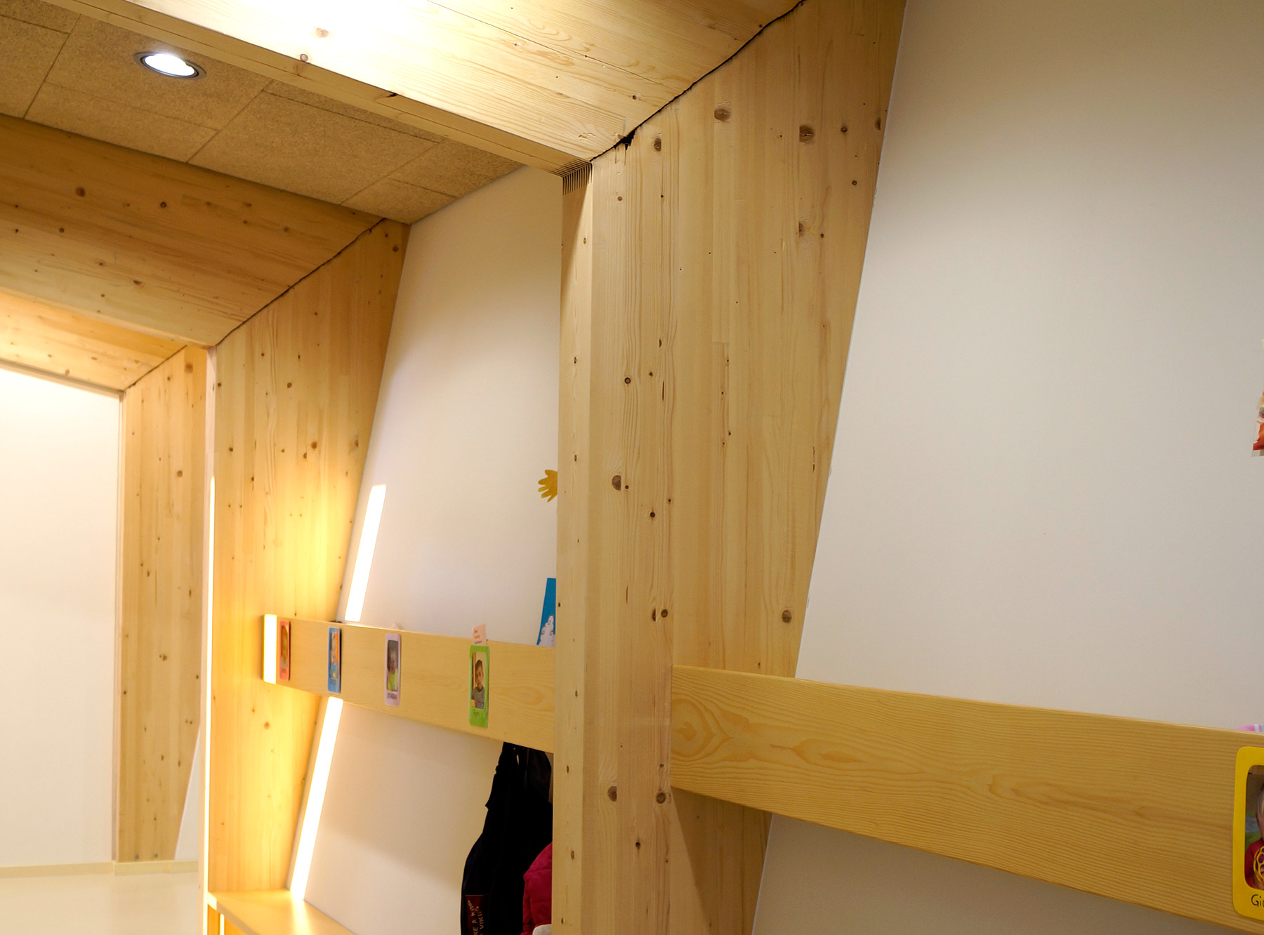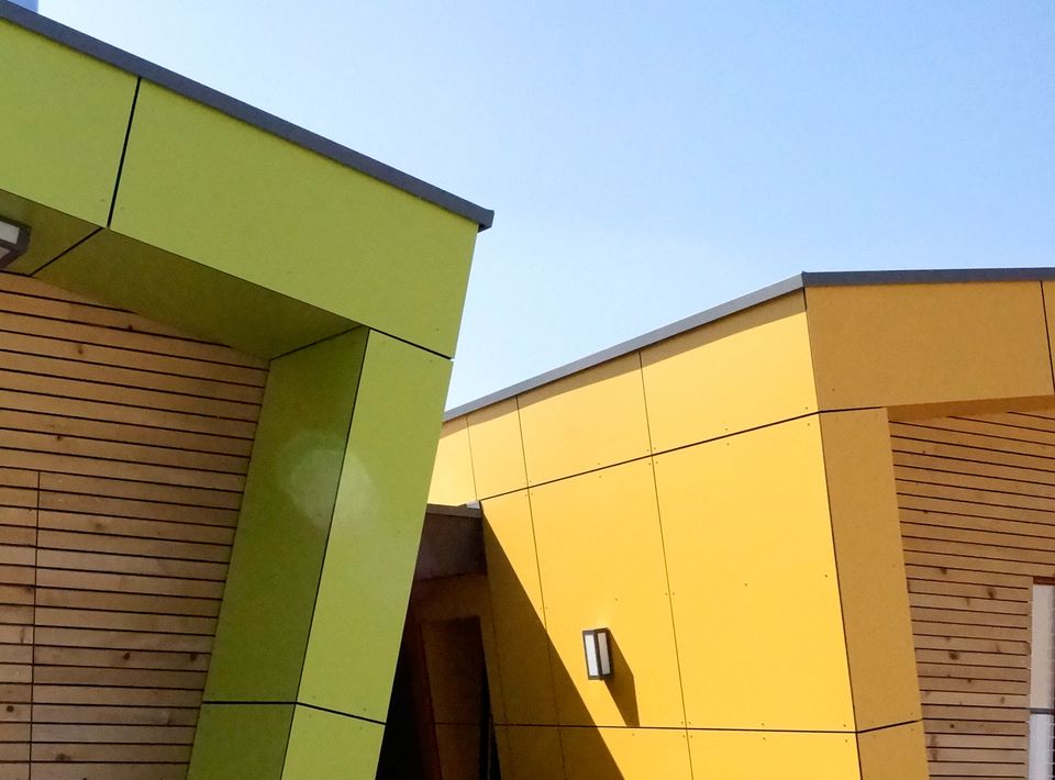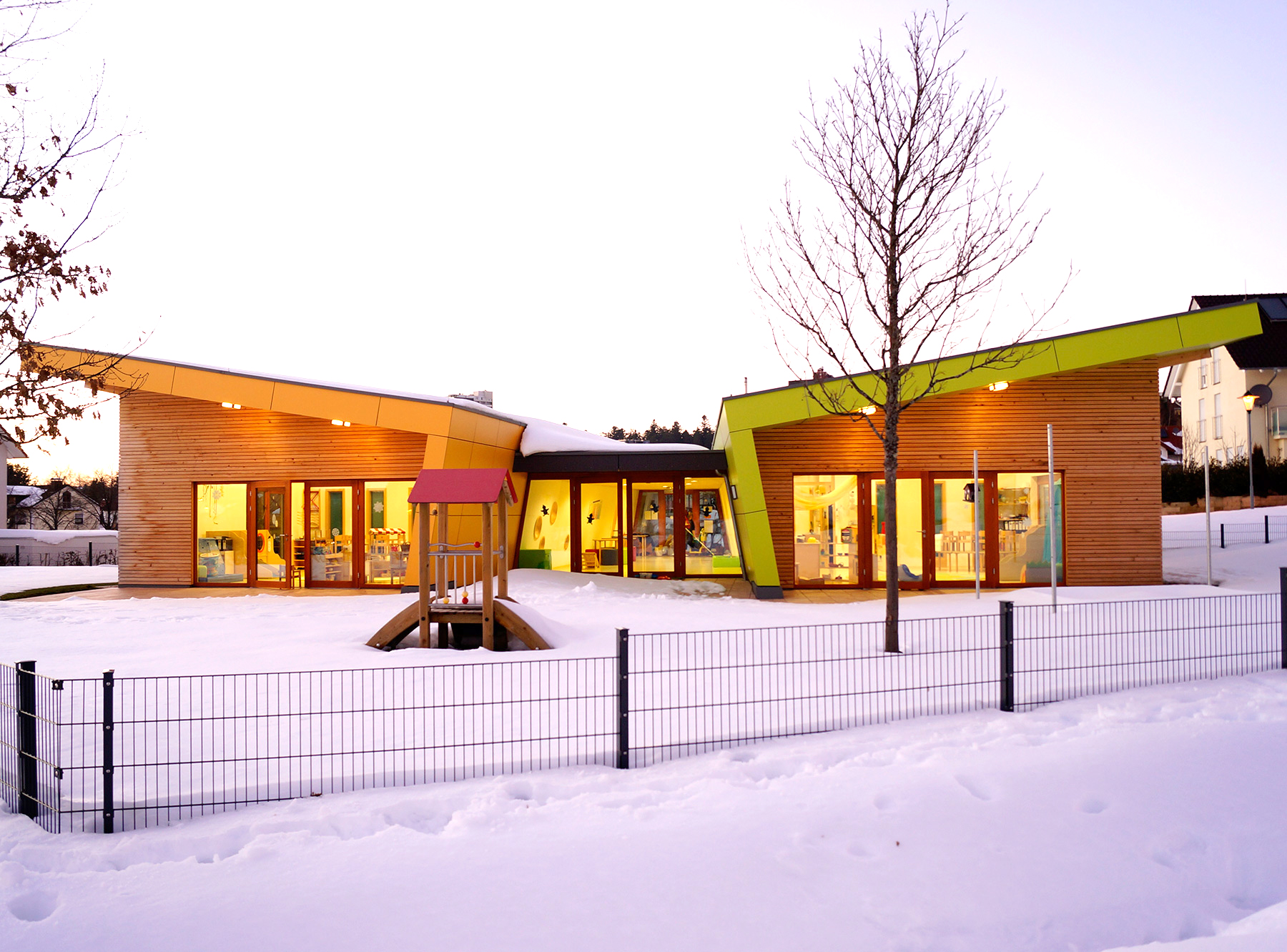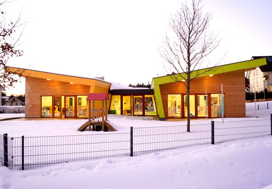 Das Grundstück für die Kinderkrippe befindet sich mitten in einem Wohngebiet. Um sich dem Maßstab der umliegenden Häuser anzupassen, hat man gezielt auf ein großes Gebäude verzichtet und die Kinderkrippe in zwei schmalere Baukörper aufgeteilt, die in der Mitte über einen Flachbau verbunden sind. Durch eine zusätzliche Verdrehung der einzelnen Baukörper entstehen spannende Außen- und Innenräume.
