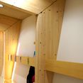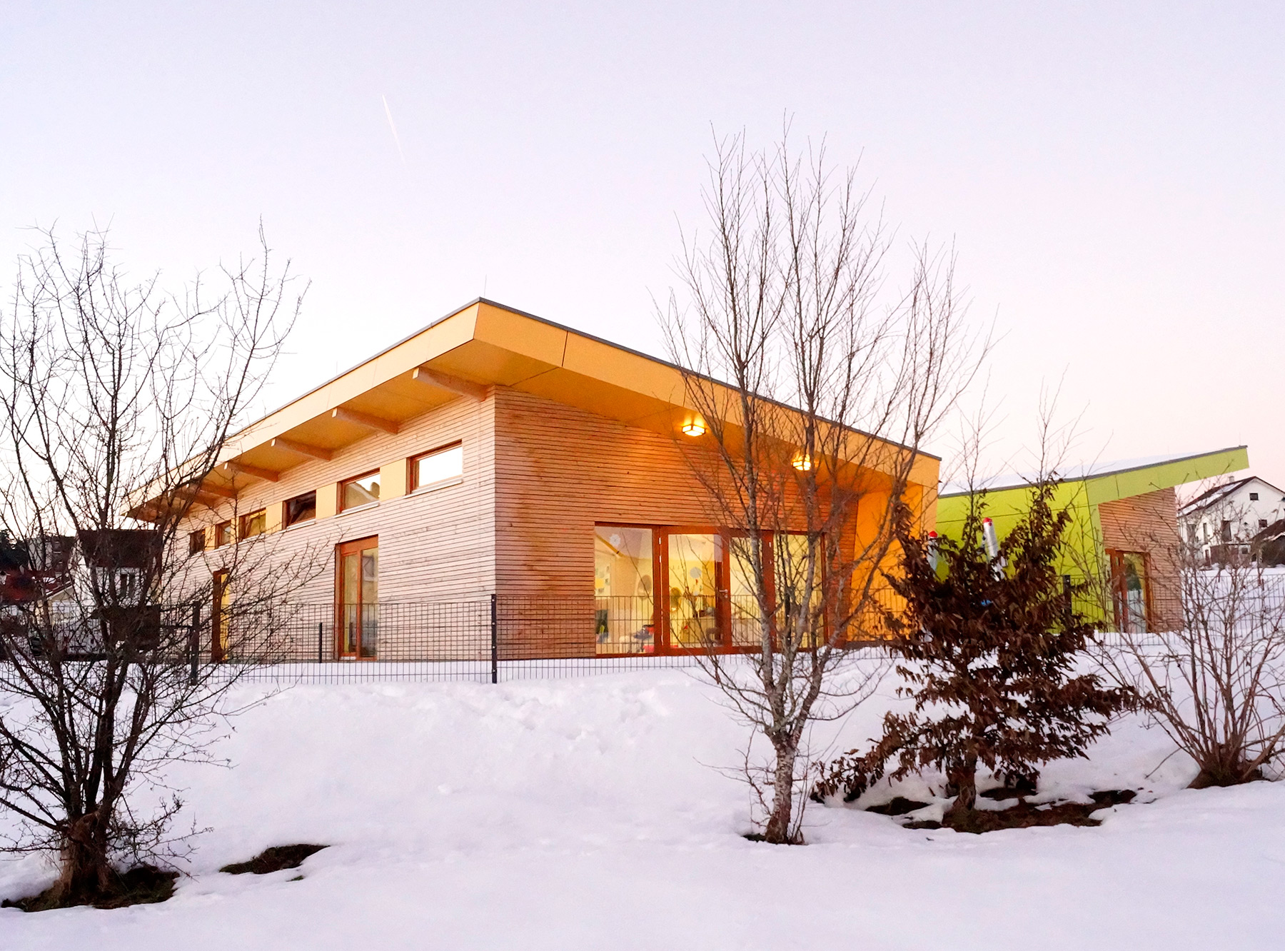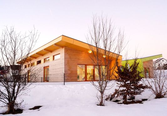 Das Gebäude wurde in Holzständerbauweise mit heimischer Weißtanne errichtet. Auch beim Innenausbau legte man viel Wert auf die Verwendung von natürlichen Materialien. Der Baustoff Holz schafft Verbindung zur Natur und sorgt für ein gesundes Raumklima.