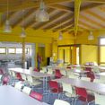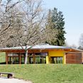 Positioniert im Zugangsbereich zum weitläufigen Schulkomplex bildet das vergleichsweise kleine Mensagebäude eine eigenständige architektonische Einheit. Leichtigkeit und Transparenz der Gebäudekonstruktion soll die reizvolle landschaftliche Umgebung bis in das Gebäude, bis in den Raum hinein wirken lassen – die Schüler sollen hier bewusst eine ganz andere Atmosphäre vorfinden wie in dem gewohnten Schulgebäude.