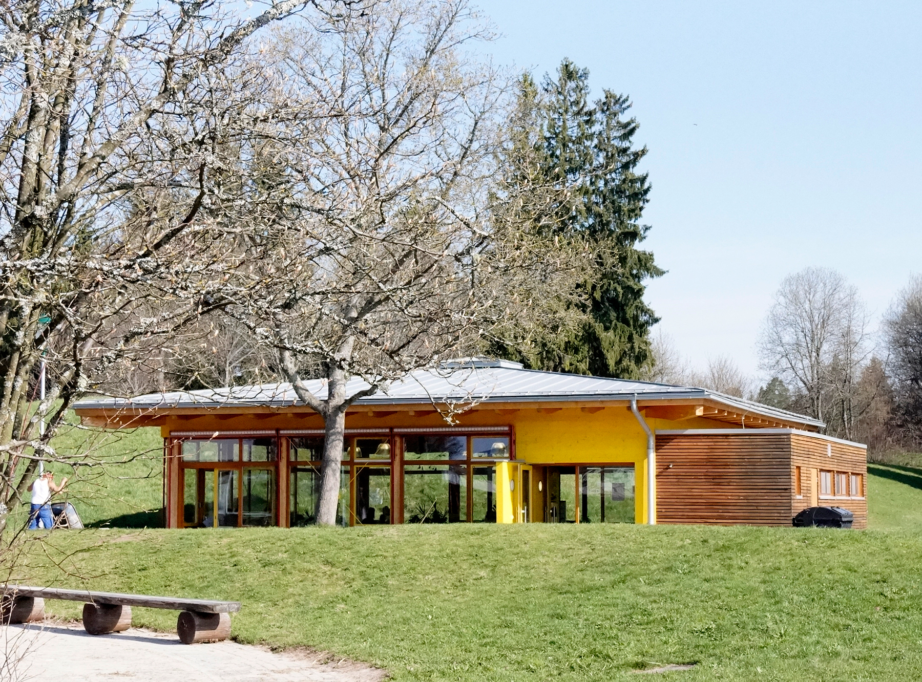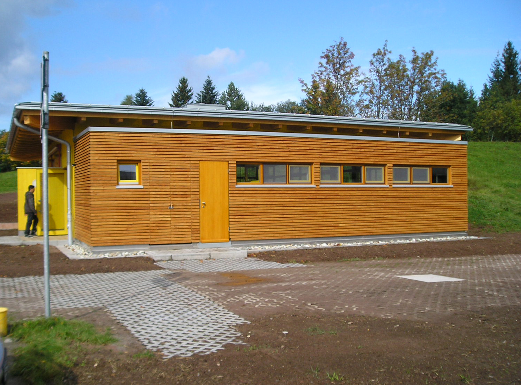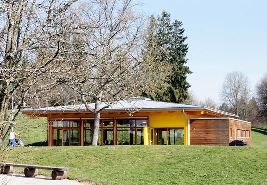 Der gesamte Baukörper wurde in Holzständerbauweise mit Tannenholz aus heimischem Wald errichtet. Die Dachdeckung wurde in verzinktem Aluminium ausgeführt. Bei der farblichen Gestaltung dominiert die Farbigkeit des Naturholzes die ergänzt wird durch einige wenige Flächen im Farbton gelb und rot.