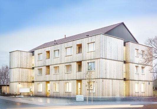 Der Bauherr hat sich für zwei Wohngruppen mit je neun Zimmern entschieden. Der gesamte Verwaltungs- und Gemeinschaftsbereich ist auf einem Geschoss angeordnet. Der Entwurf besteht aus zwei versetzt gegenüber angeordneten Wohnblicken. An zwei Ecken befinden sich versetzt vorstehende Baukörper in denen sich das Treppenhaus, ein behindertengerechtes Zimmer sowie Pflegebad befinden. Die insgesamt vier Blöcke werden durch Glaselemente miteinander verbunden.