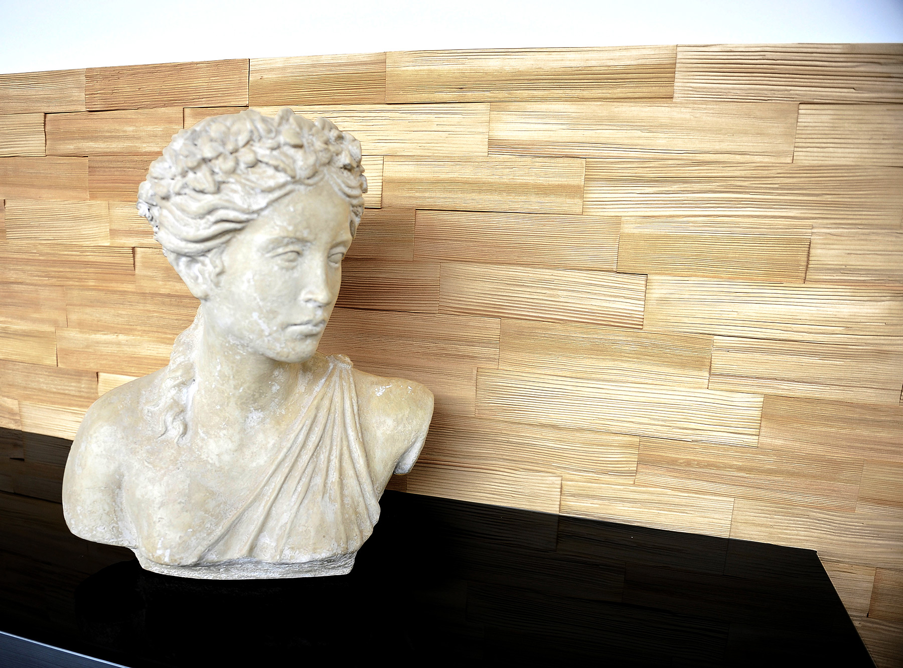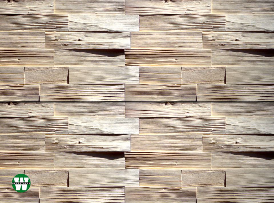 Weißtanne als Wandverkleidung und Weißtanne als Dachschindel, zwei bekannte Produkte, wurden hier kreativ-innovativ kombiniert und in einen neuen Kontext gesetzt. Das vorgestellte Produkt ist eine Wandverkleidung aus verschieden starken Spaltstücken aus massivem Weißtannenholz, die auf einer Trägerplatte angeordnet eine dreidimensionale Reliefwirkung erzielen. Ein industrieller und preisgünstiger Fertigungsprozess sowie die einfache Verlegung im Steckprinzip überzeugen. Die Weißtanne besticht dabei durch ihre gute Spaltbarkeit, d.h. eine effektive Materialausnutzung und weitgehend glatte Spaltoberflächen. Die natürlich helle Patina der Weißtanne und der Oberflächenschimmer kommen gut zur Geltung und vermitteln ein authentisches Holzerlebnis.