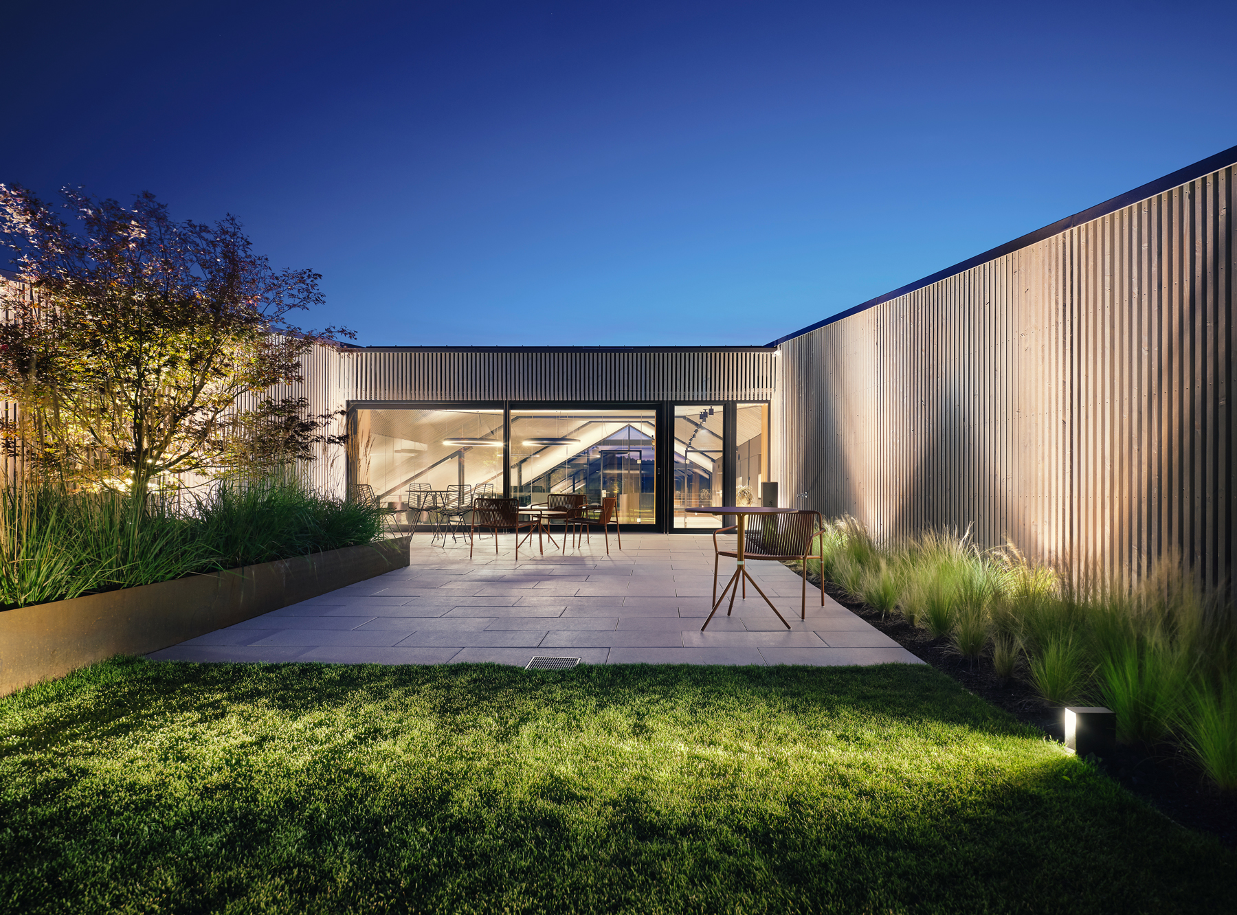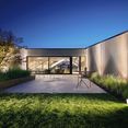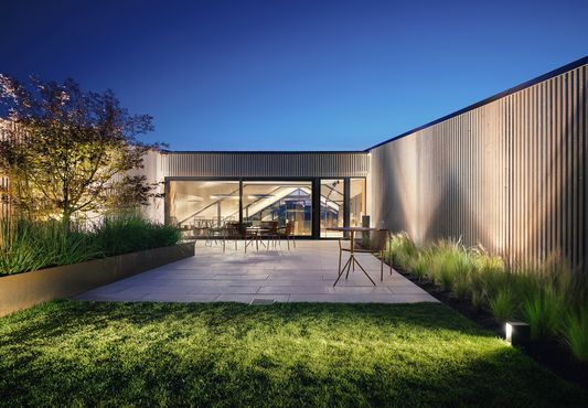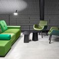Eine Besonderheit in der Innenraumgestaltung ist aber zweifelsohne das Architekturbüro selbst. Hier konnten sich die beiden Architekten frei entfalten. Im Mittelpunkt steht ein imposanter Galerieraum, dessen Raumgefühl durch eine voll verglaste Westfront potenziert wird. Die Lamellenverschalung der Außenfassade findet sich auch im Innenraum wieder, was die Grenze zum Außenraum auflöst und zudem einen rein funktionellen Grund hat: Schallabsorption.