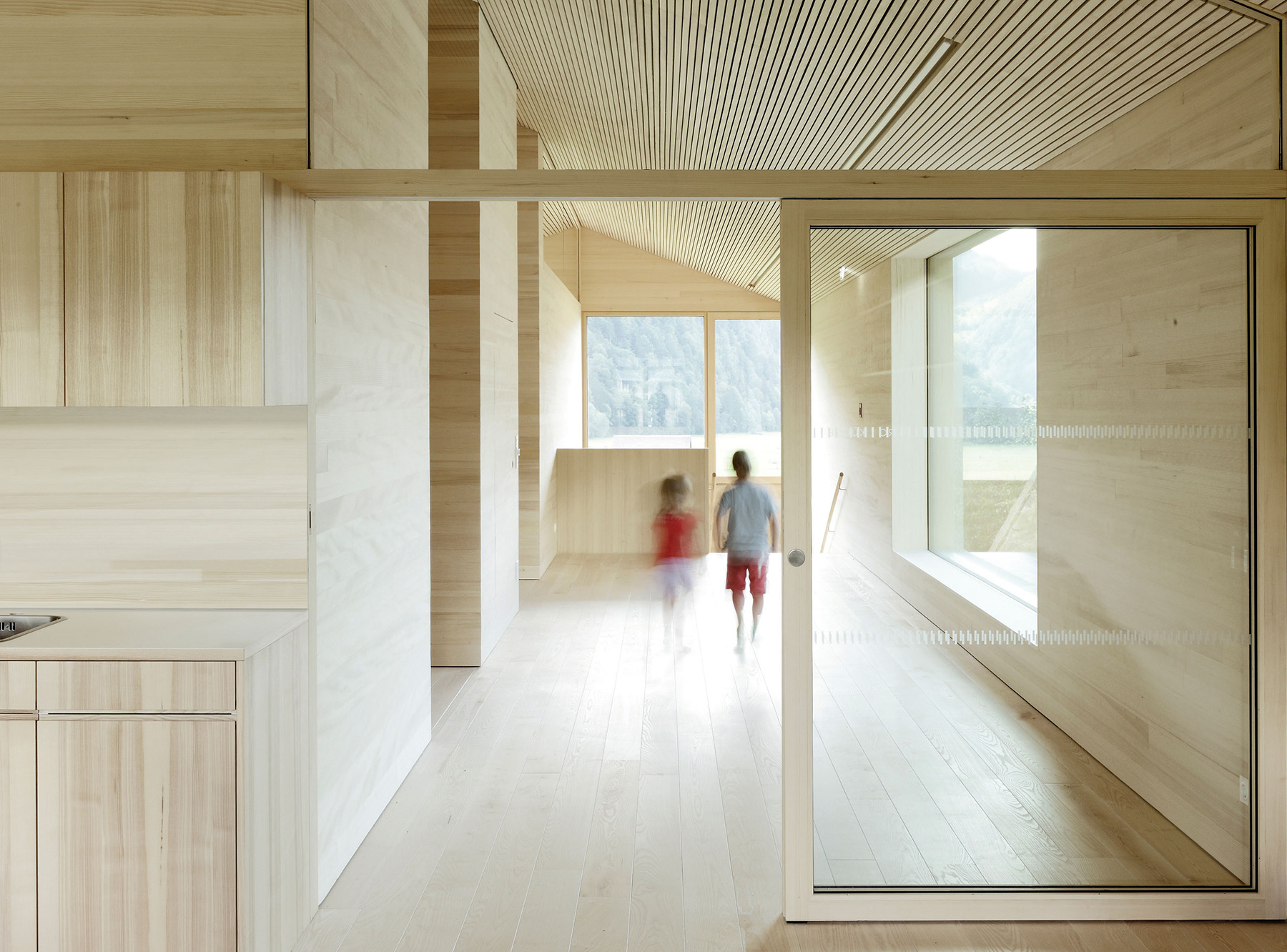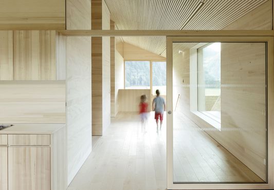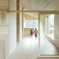 Der Einsatz von Holz war schon beim Architekturwettbewerb für den Kindergarten gefordert. Dem zugrunde liegt das intakte Ortsbild von Bizau, geprägt durch das Bregenzerwälderhaus. Durch den einfachen Satteldachtypus, mit Analogien zum Schopf im Eingangsbereich und südseitig vor den Gruppenräumen, fügt sich der Kindergarten mit großem Selbstverständnis in die Siedlungsstruktur. Bauform, Stellung und Schindelfassade in Weißtanne erzeugen die gewünschte Ensemblewirkung mit dem angrenzenden historischen Wälderhaus. Die einfache Konstruktion kombiniert Massivholzteile und Holzelemente, Plattenwerkstoffe werden gänzlich vermieden. Innen mag das Haus überzeugen durch seine räumliche Raffinesse, die haptischen Qualitäten der Weißtanne und die Präzision im Detail.