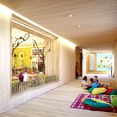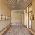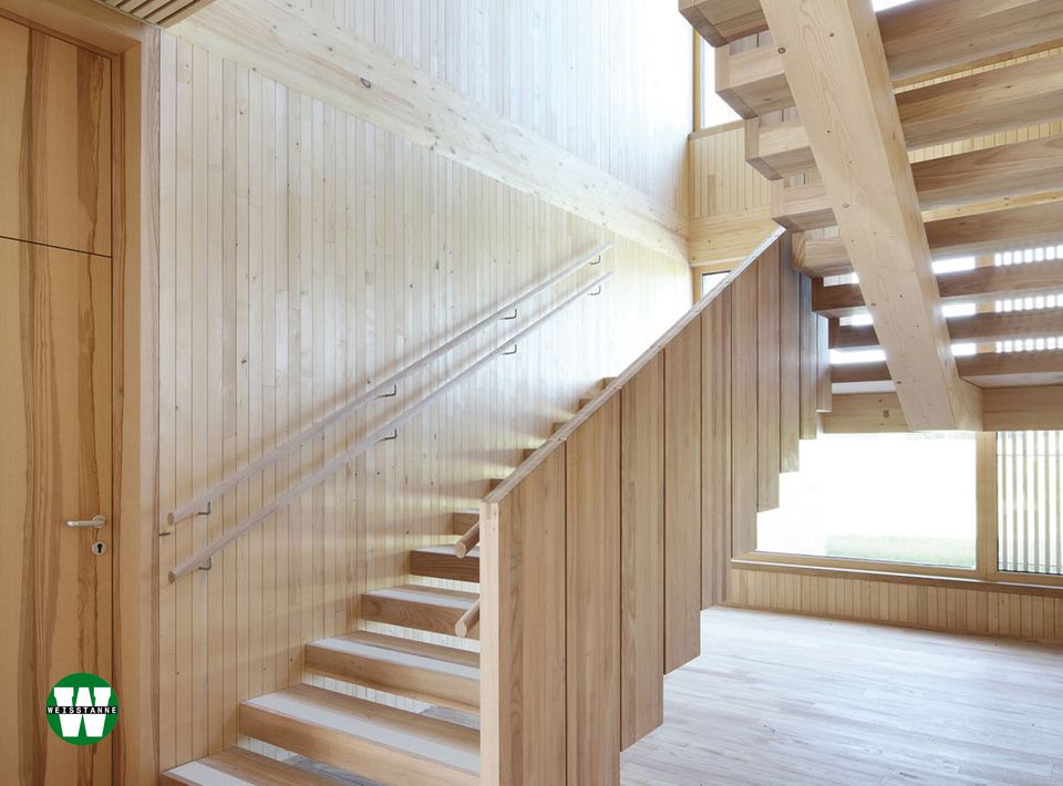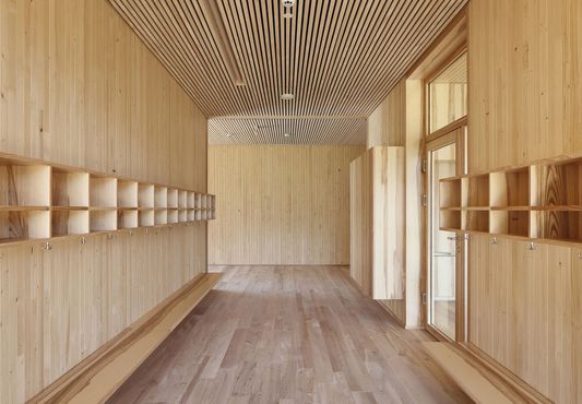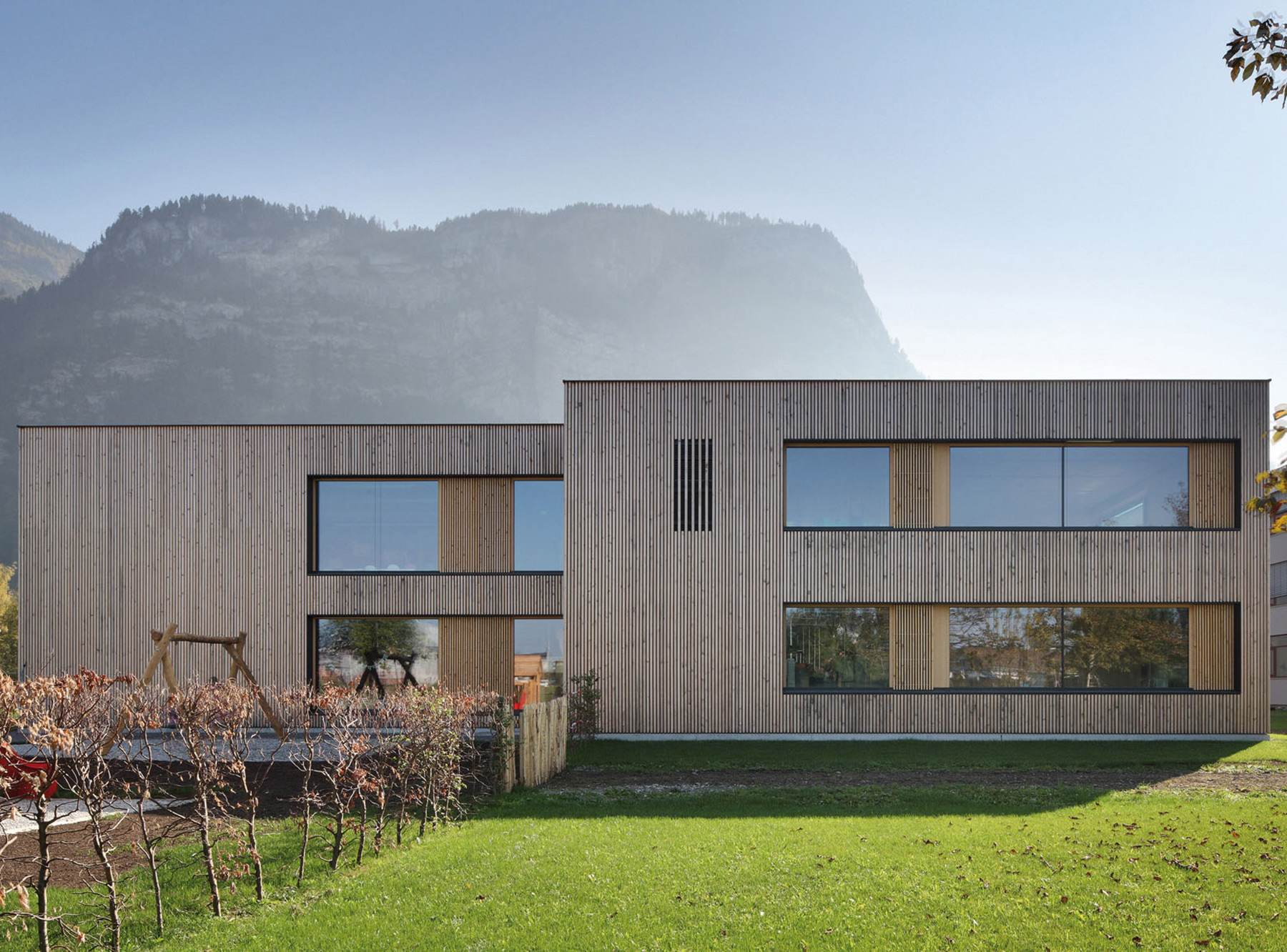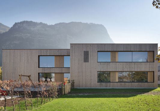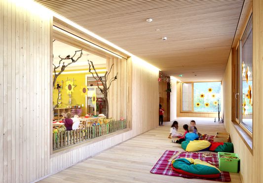 Dornbirns stadteigener Forst lieferte neben der Weißtanne auch Fichte, Ulme und Braunkernesche für den Bau des Kinderhauses. Jedes dieser Hölzer wurde entsprechend seiner Eigenschaften und Güte eingesetzt. So fand die Weißtanne statische Verwendung bei Massivholzwänden und -decken, bekleidet im Inneren Wände und Decken, mal als Leiste, mal als Täfer und verleiht dem kinderfreundlichen Ambiente seinen warmherzigen Charakter. Winterschlägerung, Trocknung und kurze Transportwege runden die gute Ökobilanz der soliden, wohldurchdachten Architektur ab.