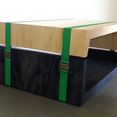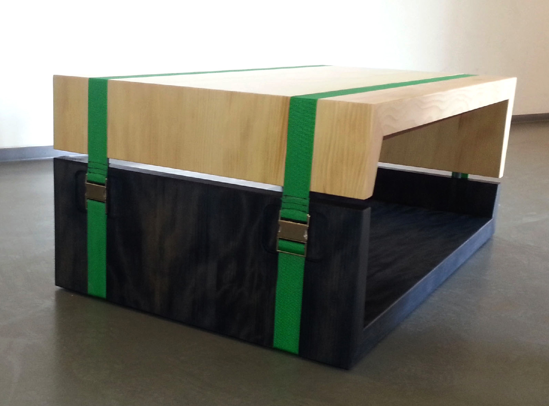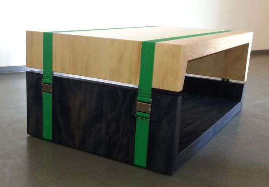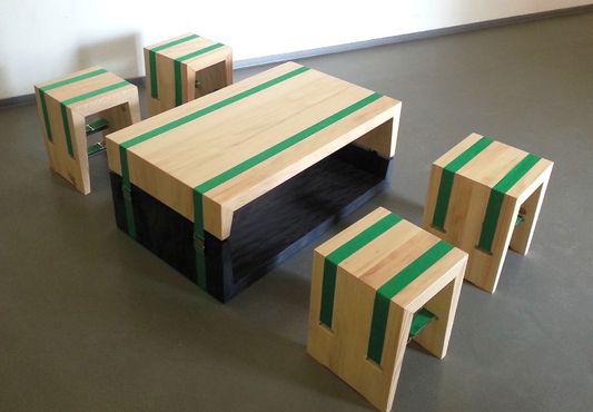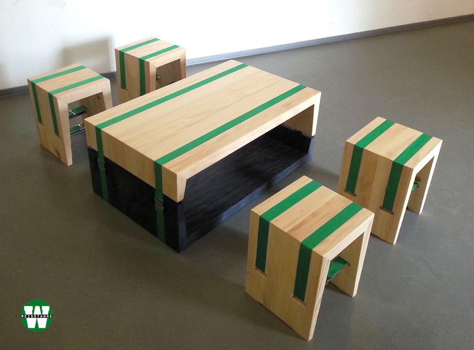 Diese moderne Interpretation einer klassischen Möbelkonstruktion in Massivholz bezieht ihre formale Stärke aus der Spannung zwischen der feinjährigen Weißtanne und dem plakativen Grün der Gurtbänder, welches kontrastreich einerseits die zerlegbare Konstruktion, im wahrsten Sinne des Wortes, spannungsreich zusammenhält und andererseits das Anliegen des Weißtannenforums in der Farbigkeit des Logos symbolhaft widerspiegelt: Ein grünes Band aus Ökologie und Nachhaltigkeit vereint die unterschiedlichen Interessen des Weißtannenforums zum Nutzen aller Beteiligten.