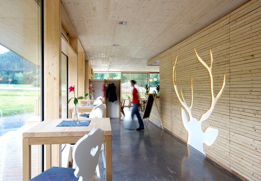 Segways usw.) und zukünftigem Empfangsgebäude. Die Talstation wurde baulich konsequent aus Weißtanne realisiert. Die Spaltholzschiebeläden, die großzügig verglaste Südseite und die Fassadengestaltung verleihen dem Gebäude sein besonderes Erscheinungsbild. Es handelt sich um ein Beispiel gelungener Weißtannen-Architektur.
